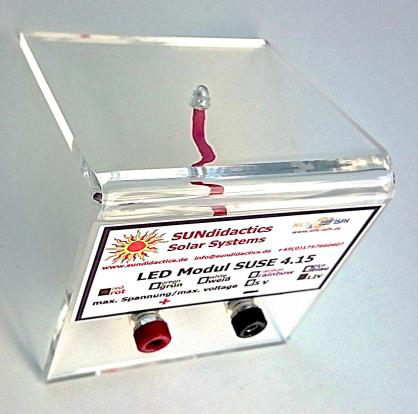 Das LED- Modul SUSE 4.15 besteht wahlweise aus einer roten, grünen, blauen, weißen oder rainbow- LED mit einem Vorwiderstand auf einem transparenten Plexiglasträger und ist zum Anschluss an eine Reihenschaltung von 3- 10 Solarzellen (5V- Version) geeignet. Wahlweise ist auch eine 12 Voder 24 V-Version (U bis 24 V) lieferbar, hier können bis zu 36 Solarzellen in Reihenschaltung angeschlossen werden.