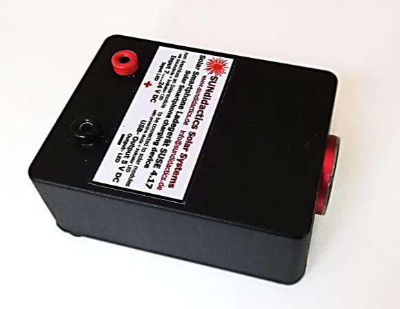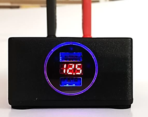 anliegt) eingebaut. So lässt sich einfach ohne zusätzliches Messgerät die Spannung des angeschlossenen Solarmoduls ablesen, sowohl im Leerlauf wie bei Smartphone- Ladung. In der Output- Buchse auf der Stirnseite befinden sich 2 USB- ports (USB-A) und dazwischen die digitale Inputanzeige mit 1 Kommastelle. Mit blauen LEDs werden die ports beleuchtet. Maximale Ausgangsstromstärke ist wie bei den anderen Versionen 3100 mA (Summe bei beiden ports!). Das nebenstehende Foto zeigt den Output auf der Stirnseite, der Ring und die ports sind blau beleuchtet, dazwischen wird die Modulspannung angezeigt, 12,5 V. Erkennbar sind auch die beiden Input- Kabel (rot + schwarz) in den Input- Buchsen auf der Oberseite des Gerätes. Die blauen LEDs und die Anzeige selbst benötigen nur wenig Stromstärke, ca. 20 - 30 mA! Auch bei SUSE 4.17U ist eine Schottky- Diode am Input als
