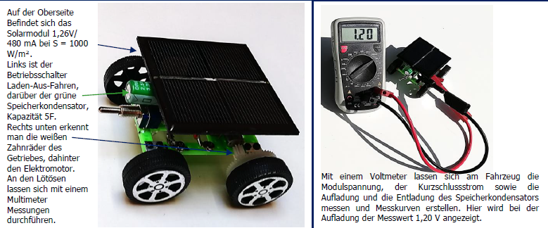 Über dem 3-Positions-Schalter ist der Speicherkondensator (Superkondensator 5F) angeordnet, er kann die vom Solarmodul gelieferte Energiemenge von 4 J speichern und nach Umschalten zum Fahren nutzen. Nach dem Umschalten fährt das Auto mit dieser Energie ca. 30m, auch in lichtschwachen Räumen. Aufladen lässt sich der Speicherkondensator entweder Outdoor im Sonnenschein/ Tageslicht oder im Innenraum mit Halogenoder Rotlichtlampe (LED- Lampen sind wegen des ungeeigneten Lichtspektrums nicht verwendbar).