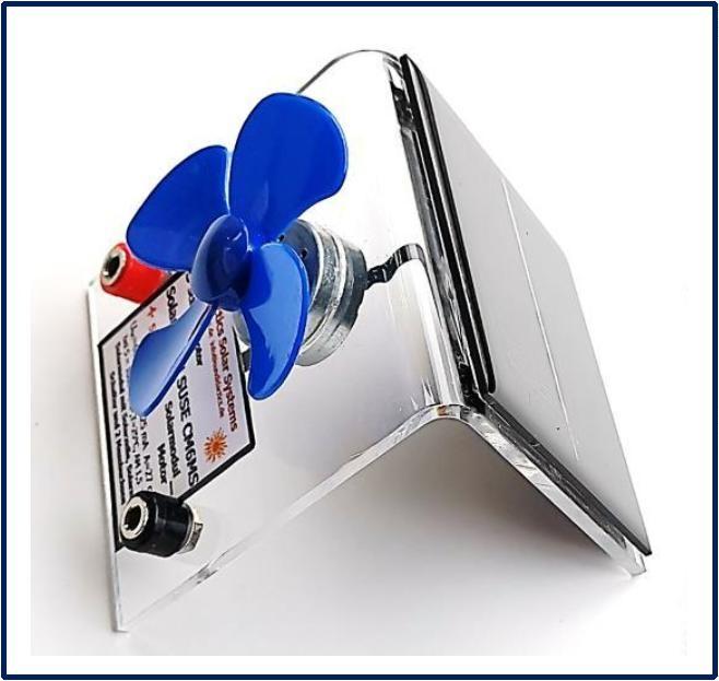 Auf dem dachförmig gebogenen Modulträger aus Plexiglas (Gesamtmaß 160 x 80 mm) erkennt man rechts die Solarzelle (bruchfest eingebettet in das Solarmodul SUSEmod2 18) mit den Maßen 52 x 52 mm (Solarzelle) und 75 x 75 mm (Solarmodul). Auf der linken Seite befindet sich der Solarmotor mit Propeller, der über den Schalter mit dem Solarmodul verbunden ist. Neben dem Typschild befinden sich 2 Buchsen zum Einstecken von 4mm- Laborkabeln. Hier lassen sich Spannungen und Stromstärken messen oder weitere Geräte anfügen , z.B. zusätzliche Solarmotoren SUSE 4.16, Solar- Energiespeicher SUSE 4.12 oder weitere Geräte SUSE CM6MS in Reihen- oder Parallelschaltung). Mit dem Schalter lässt sich der Elektromotor ein- oder ausschalten. Das Modul eignet sich gut für Photovoltaikexperimente in der GS und den Sekundarstufen I und II. Bei NILS- ISFH wurden hierfür umfangreiche Experimente in verschiedenen Niveaustufen entwickelt. Das Gerät wird als Fertiggerät oder Bausatz angeboten, für die handwerkliche Herstellung aus dem Bausatz sind ca. 45 Minuten notwendig. Der Kurzschlussstrom I sc der Solarzelle ist ein direktes Maß für die Lichtintensität und proportional zur Bestrahlungsstärke S, er beträgt bei strahlendem Sonnenschein (S= 1000 W/m²) 1025 mA, die Leerlaufspannung der Solarzelle beträgt 0,65 V .
