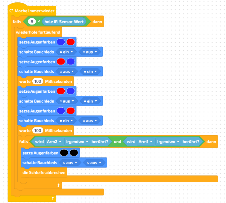 Auslösen: Sobald der IR-Sensor eine Annäherung erkennt (Wert > 8), startet ein blinkendes LED-Muster über die Augen- und weißen LEDs.