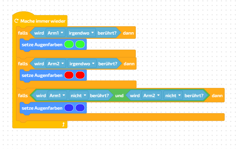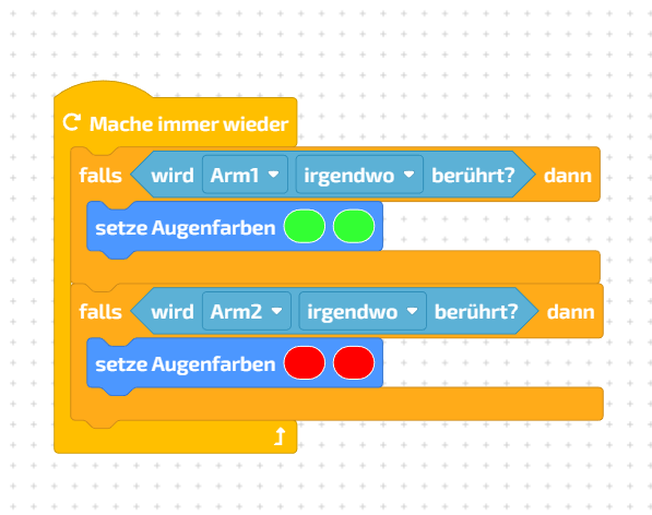 - Wird der BOB3 nicht berührt wartet er 0,5 Sekunden und setzt dann die Augen wieder auf blau.