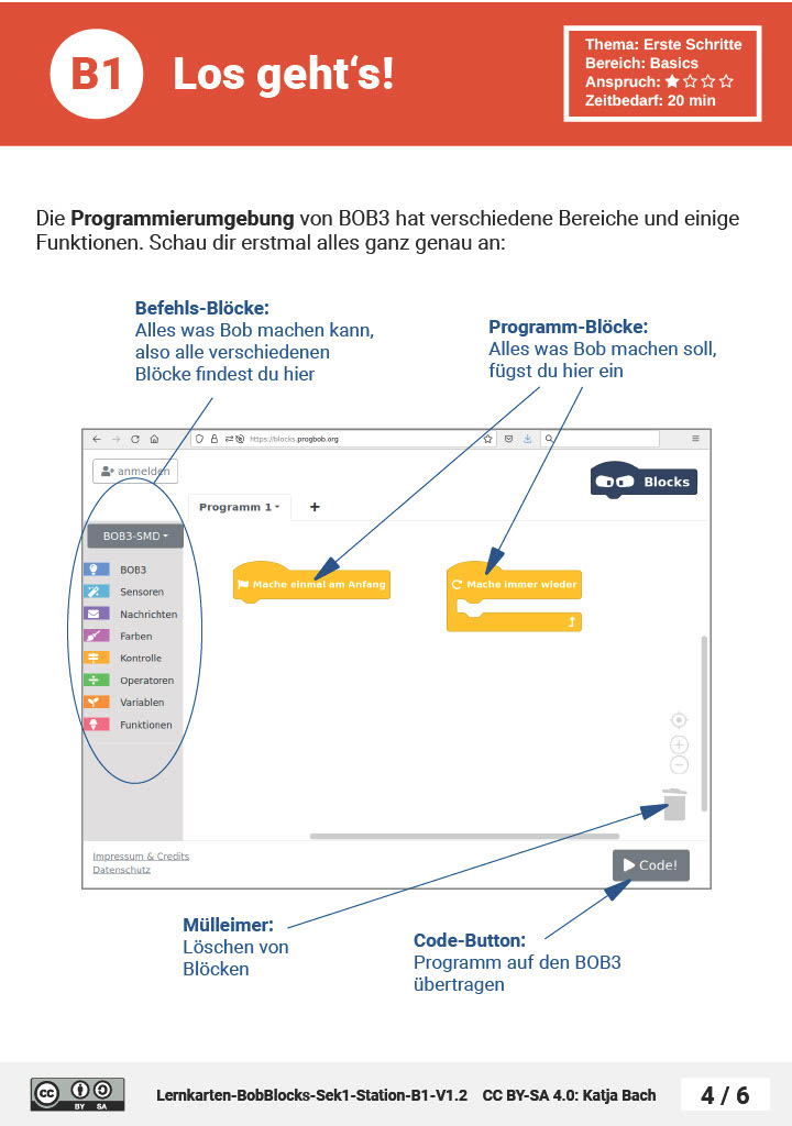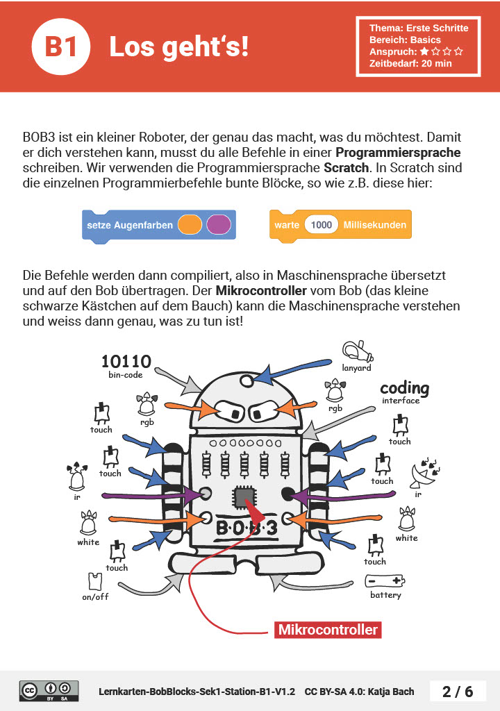 Lernziele: Überblick über die Programmierumgebung, Compilieren und Übertragen, erste Programmierschritte, Augen-Leds ansteuern, Farben ändern, Anweisungen, Bauch-Leds ansteuern, Parameter ändern