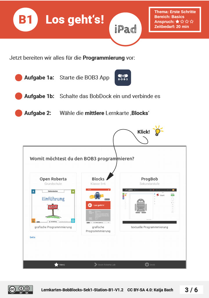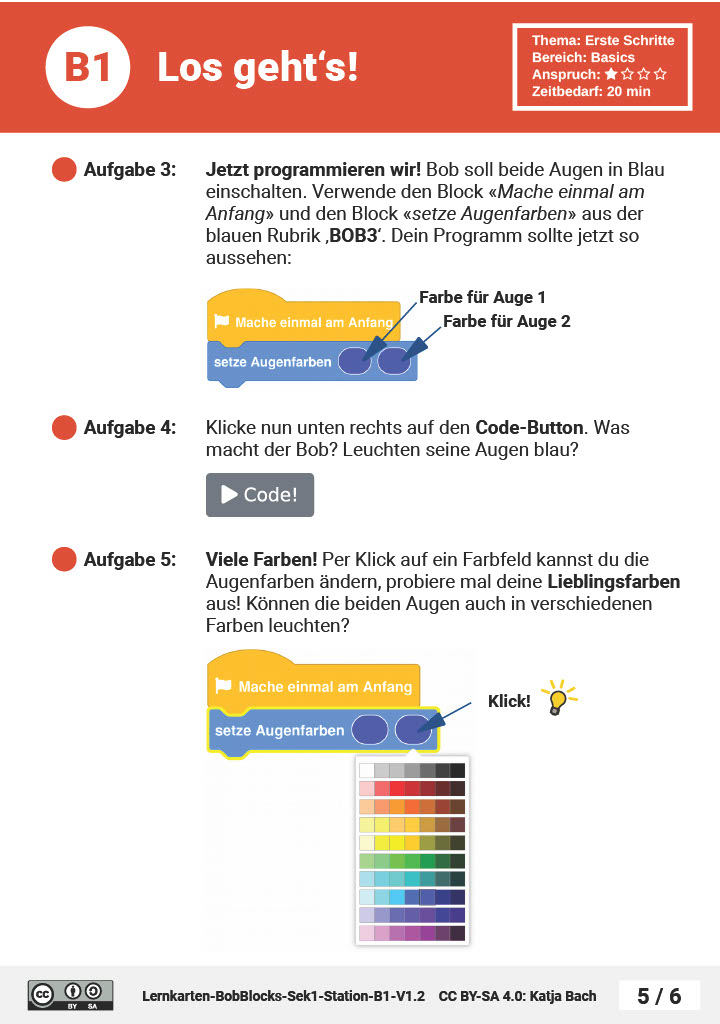 Die SuS lernen den «Mache einmal am Anfang» und den «setze Augenfarben»-Block kennen und kombinieren die beiden Blöcke zu einem ersten Programm. Dieses Programm übertragen sie auf den Roboter und testen die Funktionsweise aus. Anschliessend verändern sie die Augenfarbe und probieren das Programm wieder praktisch aus. Zum Schluss lernen sie noch den «schalte Bauchleds»-Block kennen und probieren diesen wieder am Roboter aus.