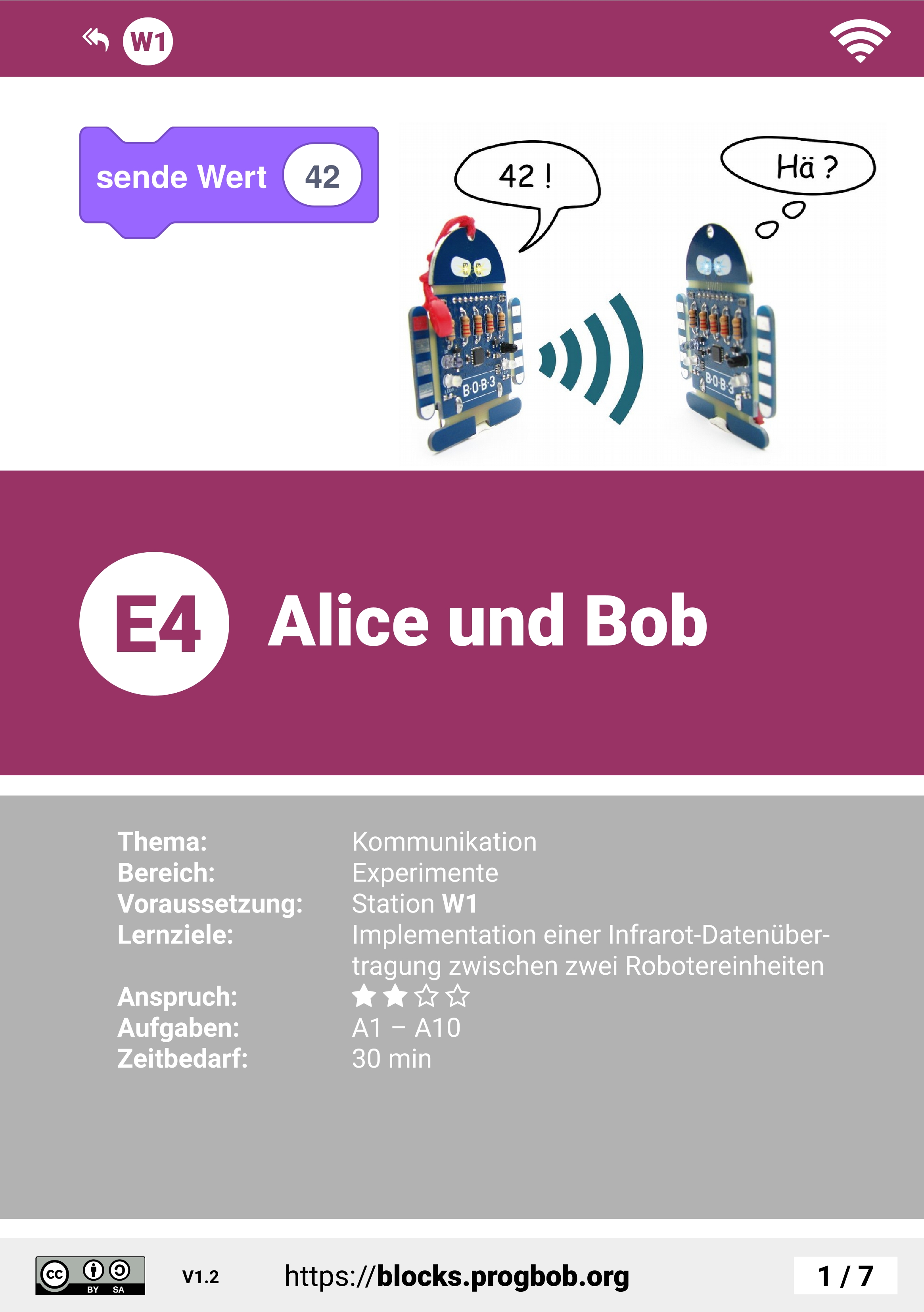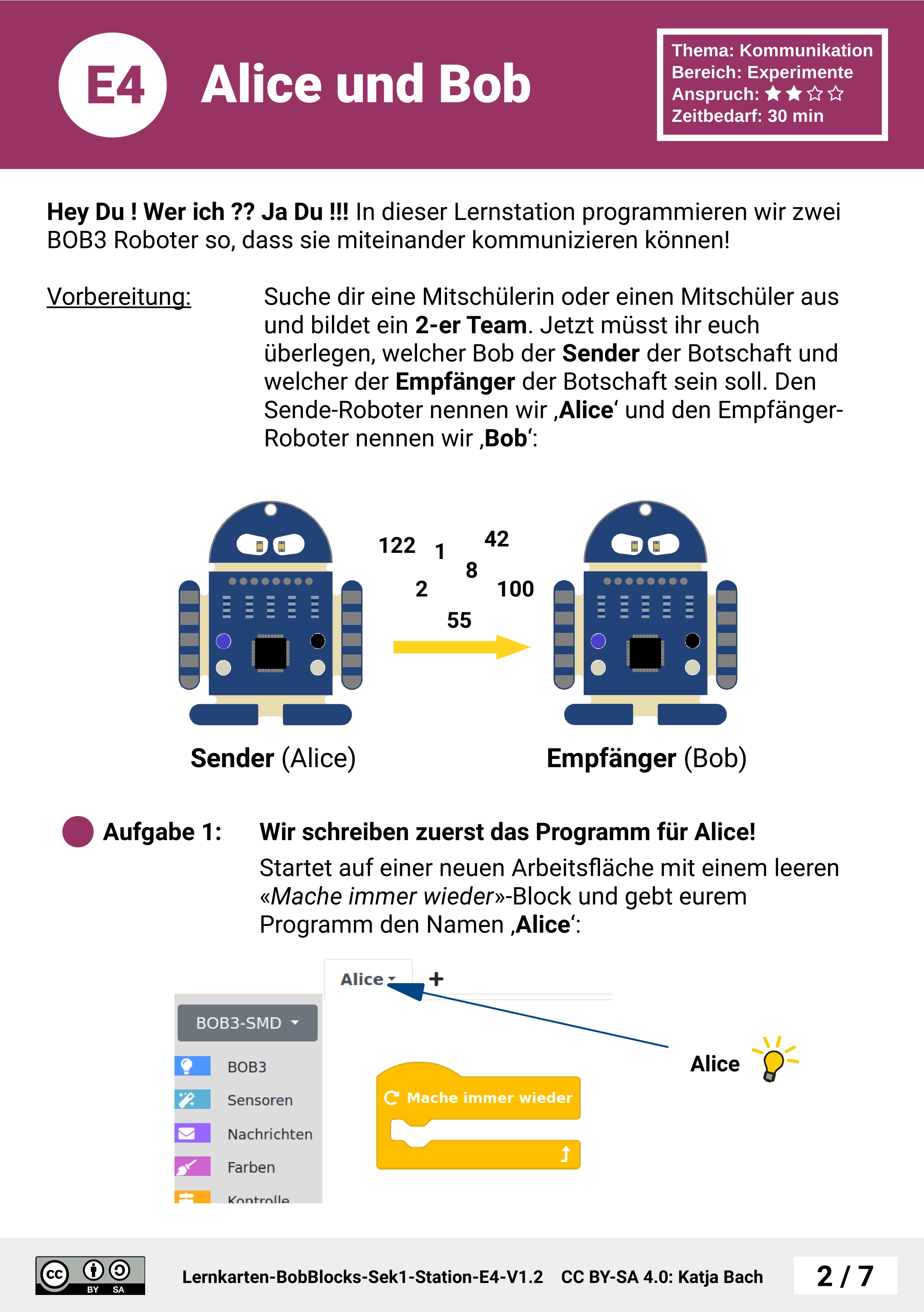 In dieser Unterrichtseinheit programmieren die Schülerinnen und Schüler eine Datenübertragung zwischen den beiden Robotern 'Alice' und 'Bob'. Alice sendet bei Berührung ihrer Arme eine Zahl, Bob schaltet je nach empfangenem Wert seine Augen ein.