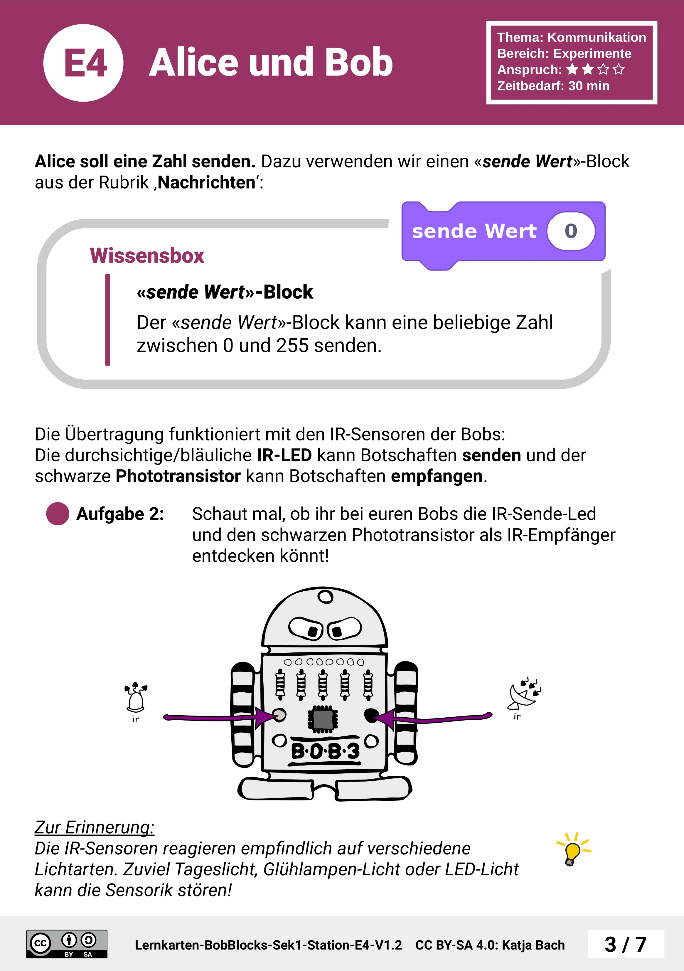 Die SuS schreiben zunächst das Programm für Alice und verwenden hierzu den «sende Wert»-Block. Um ein direktes Feedback zu bekommen wenn ein Wert gesendet wird, schalten sie bei Alice auch ein Auge ein. Als nächstes schreiben sie das Programm für Bob. Bob wartet zunächst mit dem «empfange Wert, warte bis zu 1000 ms»-Block auf eine empfangene Übertragung. Danach überprüfen sie den zuletzt empfangenen Wert mit dem Block «zuletzt empfangener Wert» und schalten - je nachdem - die Augen ein. Zum Schluss testen die SuS die beiden Programme mit ihren Robotern.