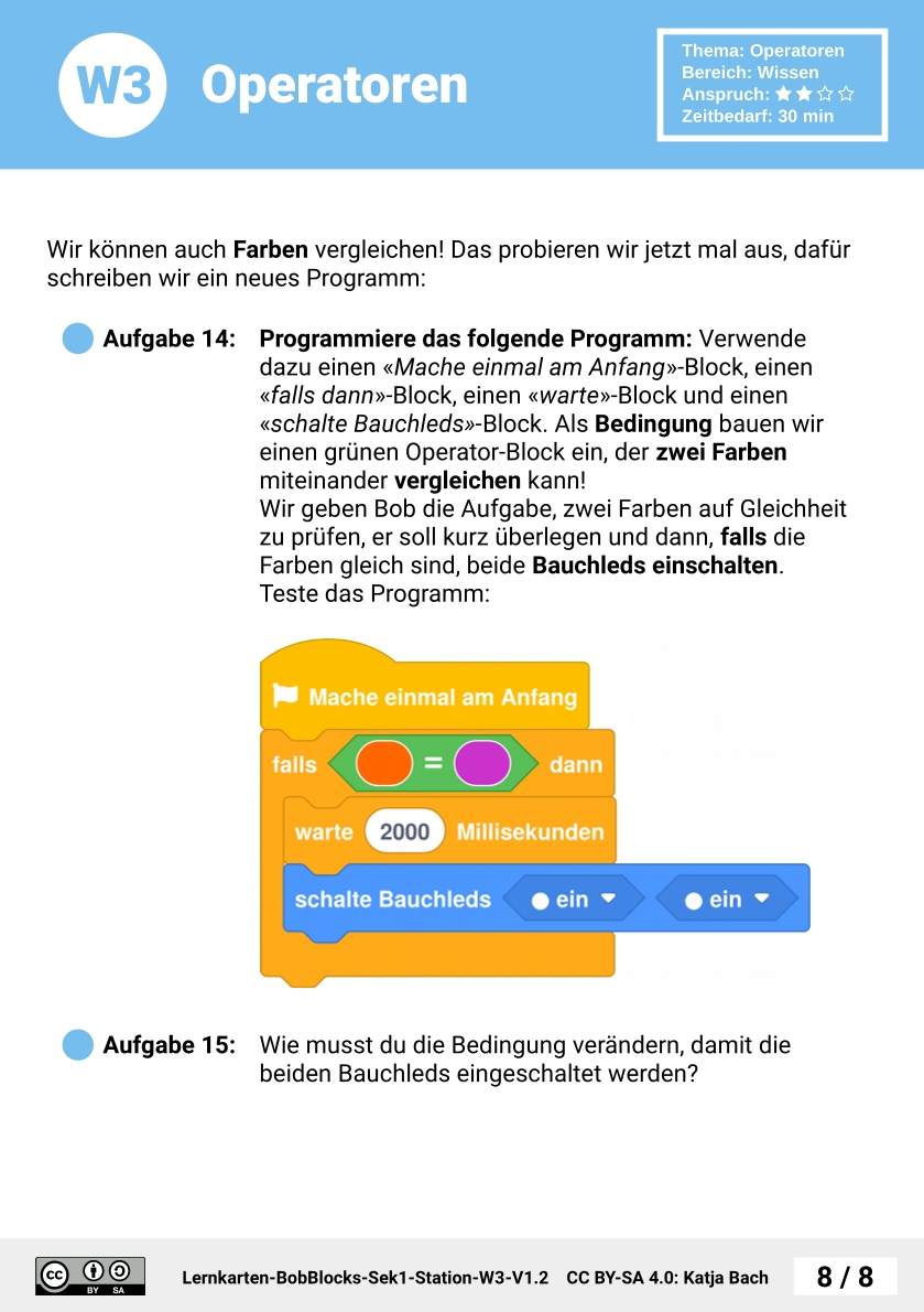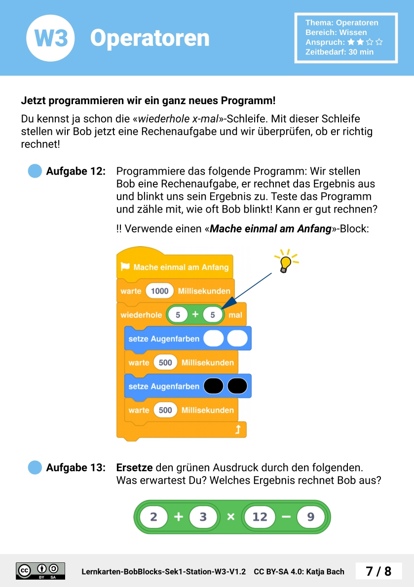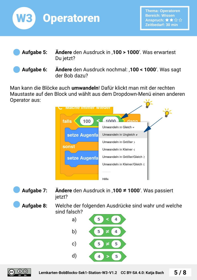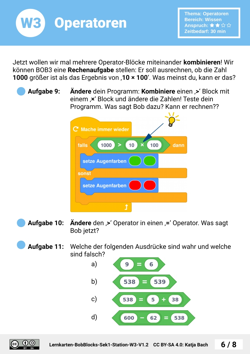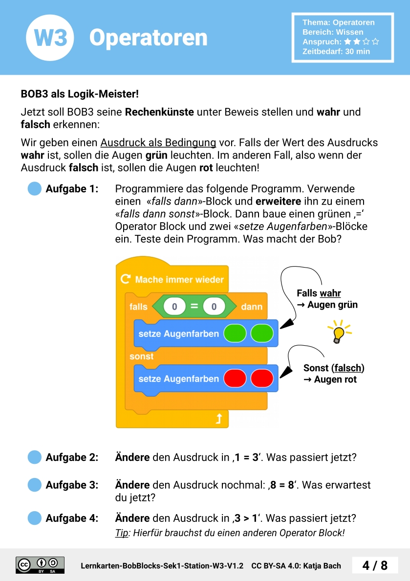 Zunächst bekommen die SuS eine Übersicht über Operatoren. Anschließend wird der Ergebnis-Typ eines Operators erklärt. Mit dem Programm 'Logik-Meister' evaluieren sie verschiedene Ausdrücke und verwenden dazu Operatoren. Im nächsten Schritt kombinieren sie mehrere Operatoren zu komplexeren Ausdrücken. Dazu entwickeln die SuS ein Programm, das Rechenergebnisse anzeigt und überprüfen damit die Rechnekünste von Bob. Zum Abschluss testen die SuS den Vergleichsoperator in Kombination mit Farb-Konstanten.