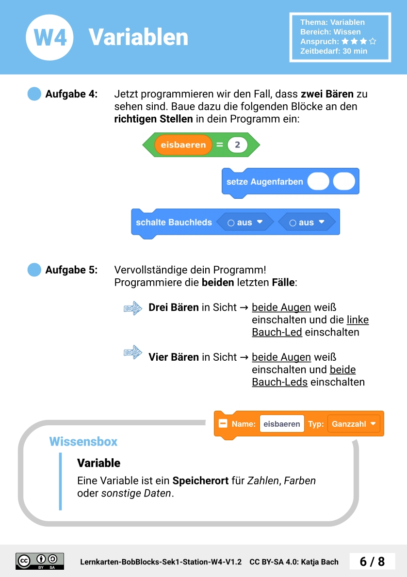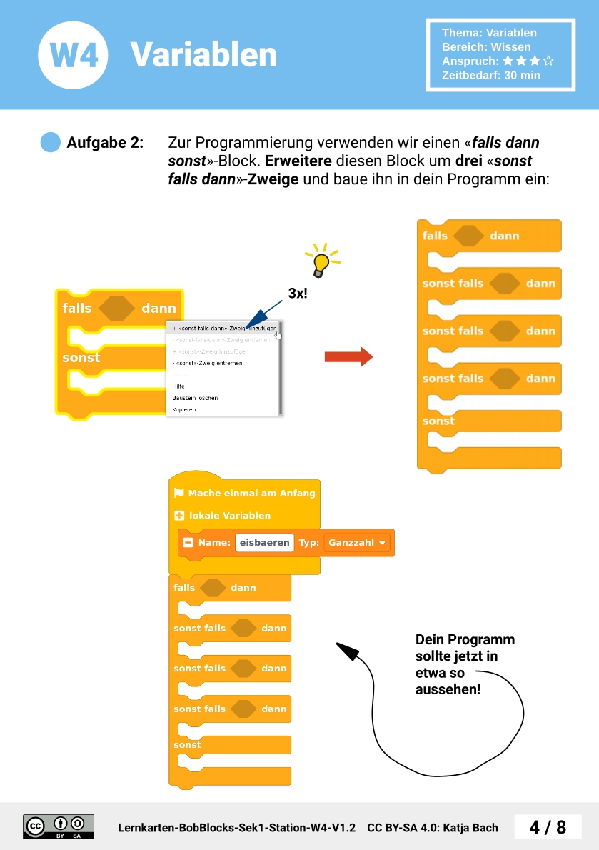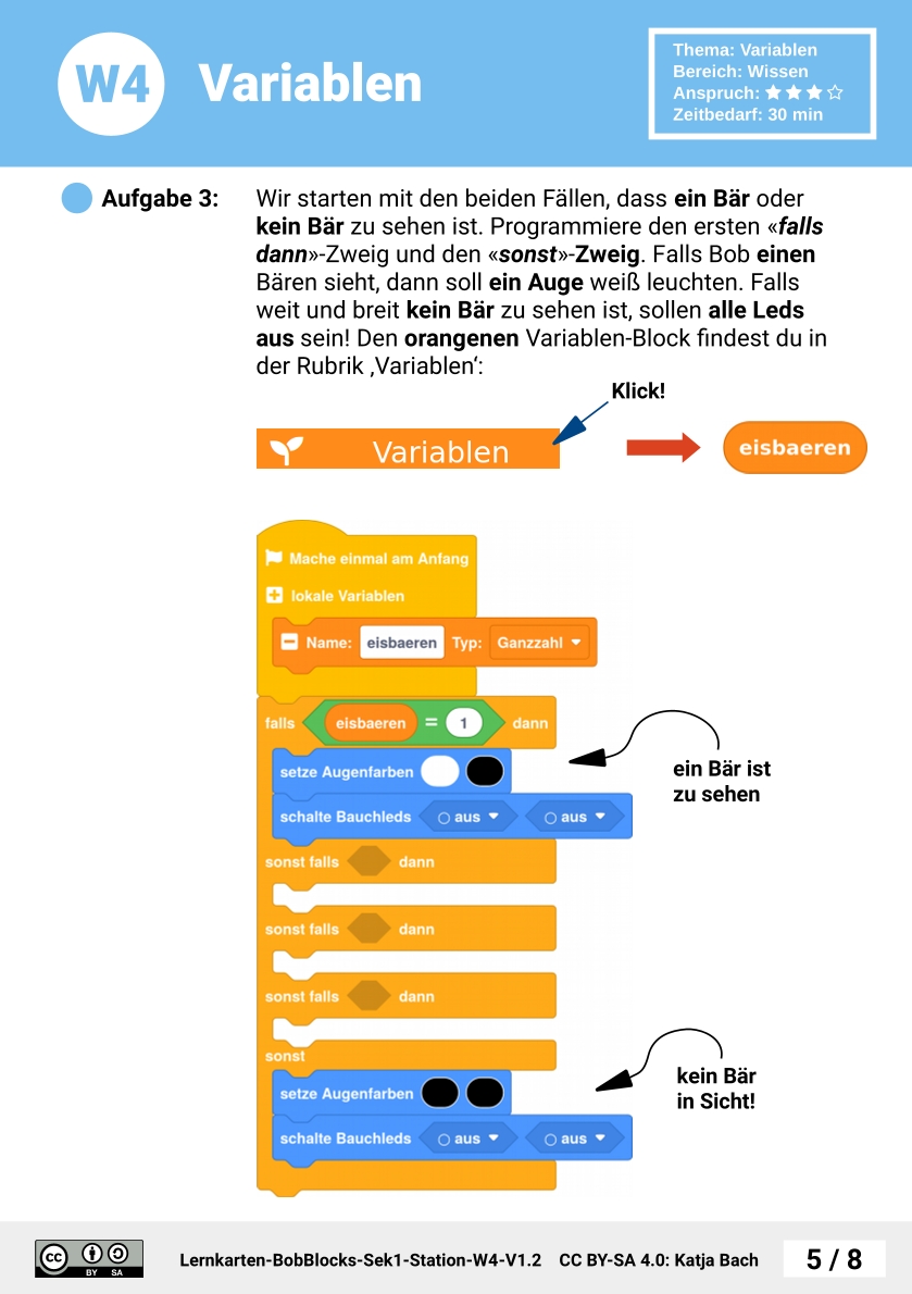 Die SuS deklarieren zunächst eine lokale Ganzzahlvariable. Anschliessend implementieren sie eine Mehrfachverzweigung für 5 verschiedene Fälle: Der Fall 1 (ein Eisbär) und der sonst-Fall (kein Eisbär) sind vorgegeben. Im nächsten Schritt erweitern die SuS das Programm für den Fall 2 selbständig mit vorgegebenen Blöcken. Anschließend implementieren die SuS die Fälle 3 und 4 komplett selbsständig. Mit dem Block «setze Variable auf Wert» testen sie ihr fertiges Programm mit unterschiedlichen Werten der Variablen aus. Als Differenzierungsaufgabe erweitern die SuS das Variablenkonzept auf Farbwerte.
