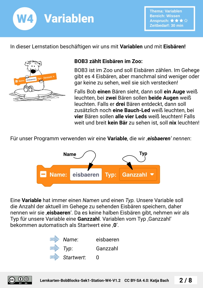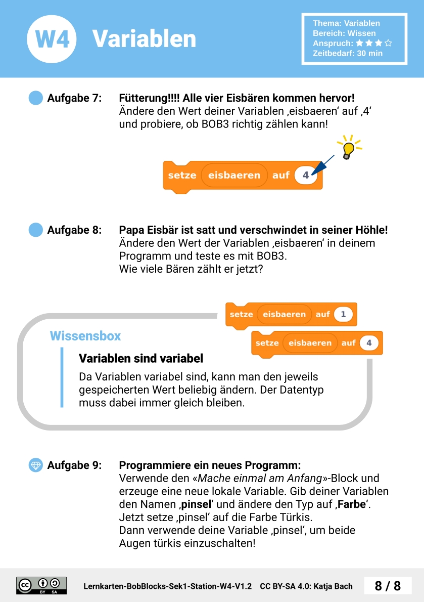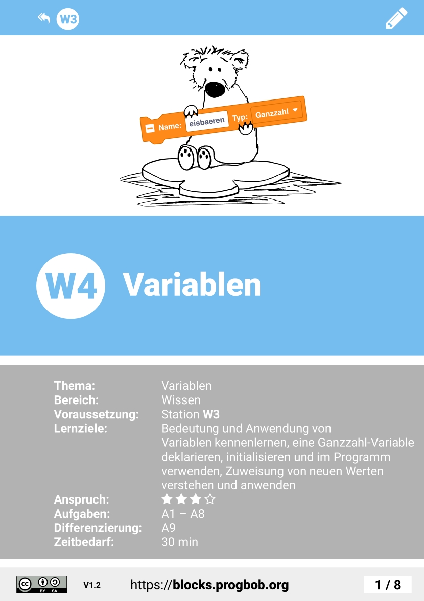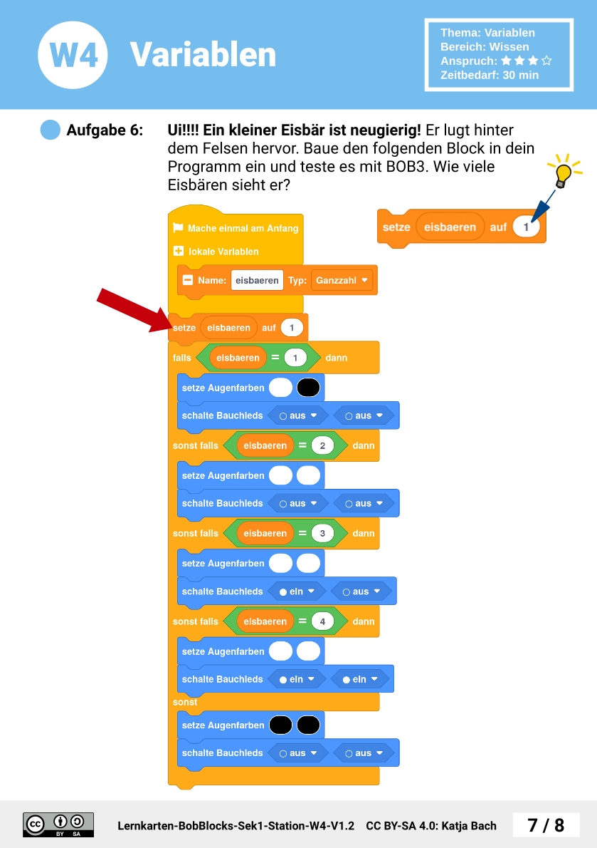 Die SuS deklarieren zunächst eine lokale Ganzzahlvariable. Anschliessend implementieren sie eine Mehrfachverzweigung für 5 verschiedene Fälle: Der Fall 1 (ein Eisbär) und der sonst-Fall (kein Eisbär) sind vorgegeben. Im nächsten Schritt erweitern die SuS das Programm für den Fall 2 selbständig mit vorgegebenen Blöcken. Anschließend implementieren die SuS die Fälle 3 und 4 komplett selbsständig. Mit dem Block «setze Variable auf Wert» testen sie ihr fertiges Programm mit unterschiedlichen Werten der Variablen aus. Als Differenzierungsaufgabe erweitern die SuS das Variablenkonzept auf Farbwerte.