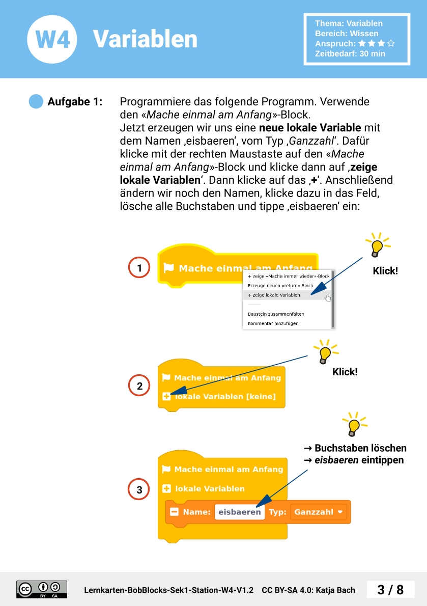 In dieser Unterrichtseinheit lernen die Schülerinnen und Schüler Variablen kennen. Die Themen sind lokale Variablen, Deklaration, Wertzuweisung und der Abruf des Variablenwertes.