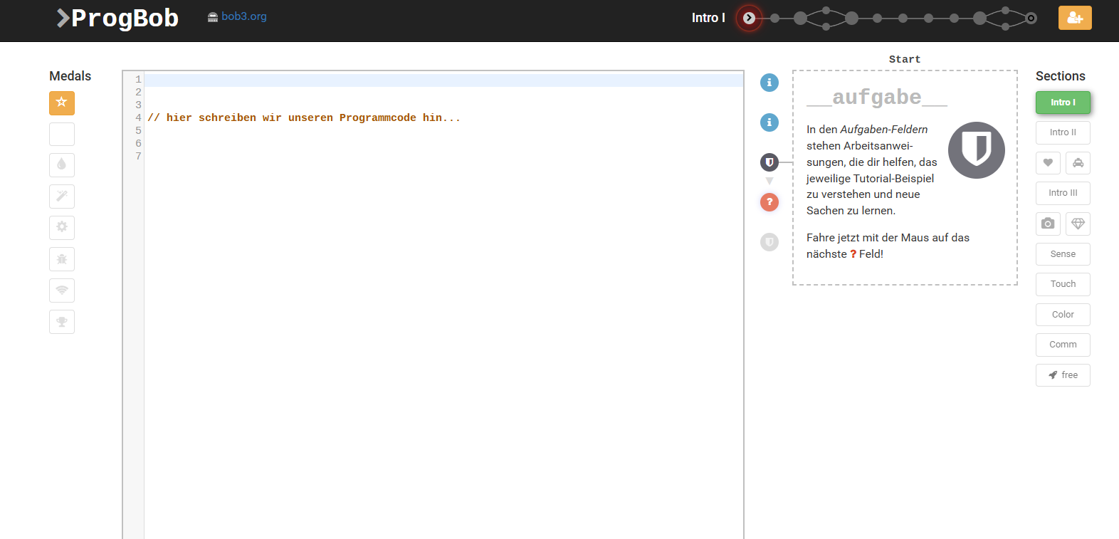 Nun startet ihr direkt in das Intro und macht euch damit vertraut. Wenn ihr an einem Punkt seid, an dem ein Programm erstellt (compiliert) werden soll, drückt den Compile-Knopf. Anschließend erhaltet ihr eine B-O-B-3-Datei. Ladet diese über Bob-Dude auf euren B-O-B-3 und probiert das Programm aus.