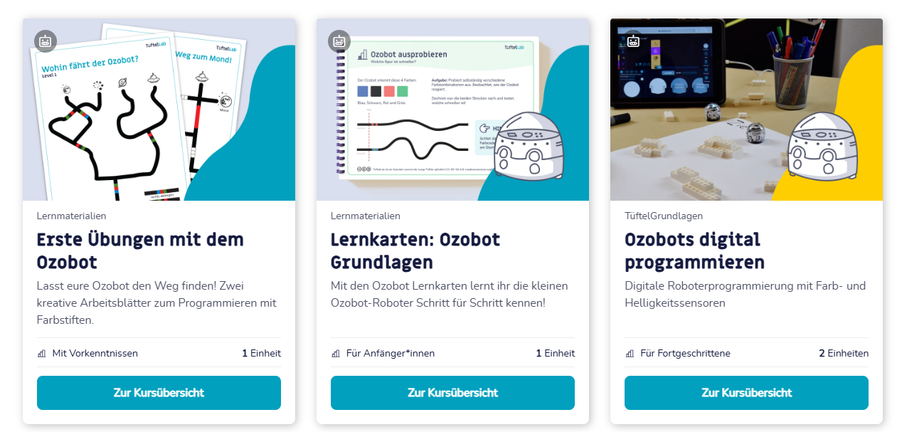Darüber hinaus bietet das TüftelLab insgesamt sechs vollständig ausgearbeitete Kurse an. Diese Kurse bauen systematisch aufeinander auf und führen Schritt für Schritt von den Grundlagen der Farbcodierung über das Erstellen erster eigener Programme bis hin zu komplexeren Aufgaben. Zusätzlich enthalten viele Materialien methodische Hinweise, Beispielaufgaben und Ideen zur Differenzierung, sodass sie sich flexibel in unterschiedliche Unterrichtssituationen integrieren lassen.