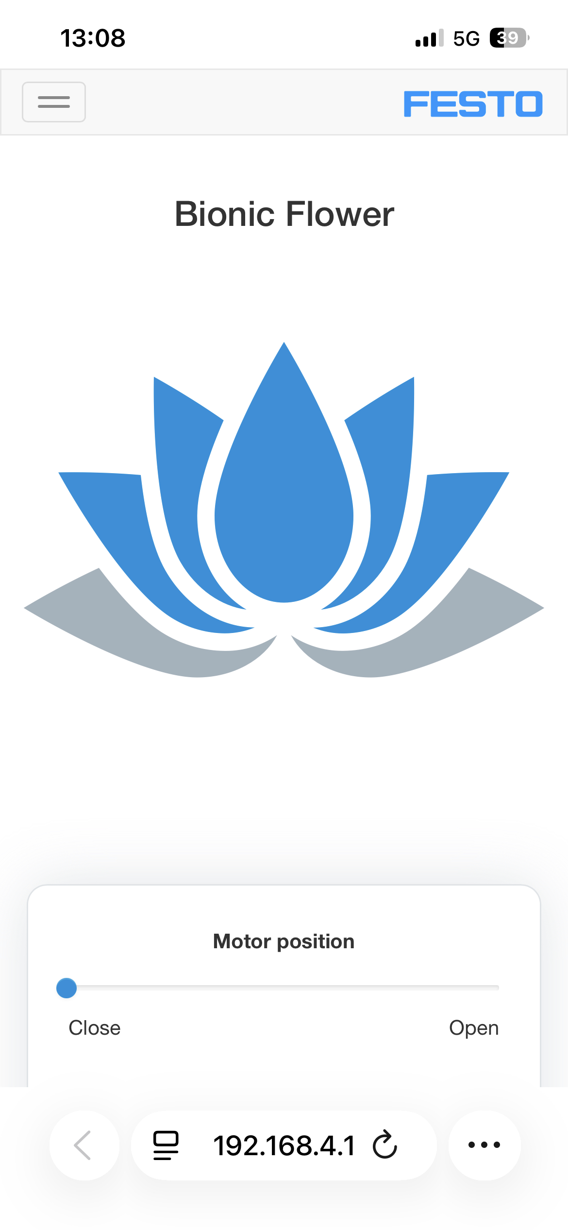 Nun ist die Flower bereit über das MArtphone gesteruert zu werden. Dazu verbinden Sie das Smartphone mit dem Hotsppot der Bionic Flower und loggen sich mit dem Passwort education ein. Öffnen sie nun die Seite b4e.de oder 192.168.4.1 öffnet sich im Brwoser ein Steuerfeld.