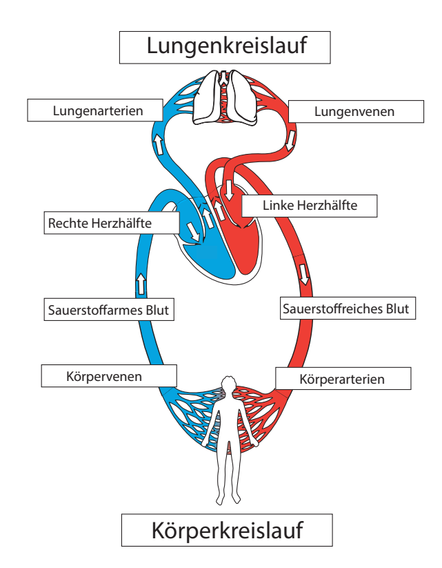 Sauerstoff ist wichtig für alle Körperzellen. Der Mensch kann ihn durch das Atmen über die Lungen aufnehmen. Die Lungen filtern den Sauerstoff (O₂) aus der Luft und geben ihn an das Blut ab, das dann vom Herzen durch den Körper gepumpt wird. Das sauerstoffreiche Blut fließt über die Lungenvene in den linken Vorhof des Herzens. Achtung: Wir beschreiben immer die Sicht aus dem Körperinneren; in Darstellungen von oben ist die linke Herzhälfte rechts und die rechte Herzhälfte links. Vom linken Vorhof gelangt das Blut durch die Herzklappen in die linke Herzkammer. Von dort pumpt das Herz das Blut in die Hauptschlagader (Aorta), sodass der Sauerstoff im ganzen Körper verteilt wird. Dort, wo der Sauerstoff benötigt wird, fließt das Blut in die kleinen Blutgefäße, die Kapillaren. In den Kapillaren diffundiert der Sauerstoff aus dem Blut in das Gewebe. Das nun sauerstoffarme Blut fließt über die Hohlvenen zurück zum Herzen, gelangt in den rechten Vorhof und von dort in die rechte Herzkammer. Von der rechten Herzkammer wird das Blut über die Lungenarterie wieder in die Lunge gepumpt, wo es erneut mit frischem Sauerstoff angereichert wird.