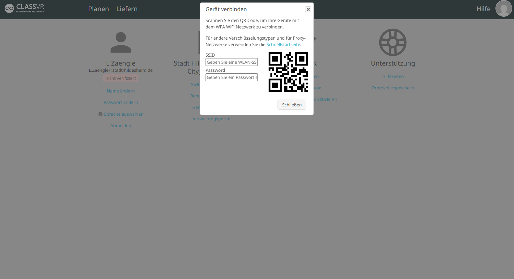 Klicken Sie oben rechts auf Ihr Profil, sodass sich die Einstellungen öffnen. Unter Netzwerk können Sie nun Geräte zu Ihrem Netzwerk hinzufügen. Dafür geben Sie Ihren WLAN-Namen und das Passwort ein. Behalten Sie das Feld mit dem QR-Code geöffnet. Starten Sie nun die VR-Brillen und öffnen Sie den QR-Code-Scanner. Scannen Sie nun den Code – sind die Brillen online. Gehen Sie nun in ClassVR auf den Reiter "Liefern" auf der rechten Seite sollten nun alle mit dem Internet verbundenen Brillen als Aktiv angezeigt werden.